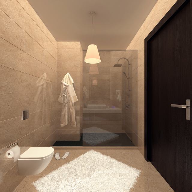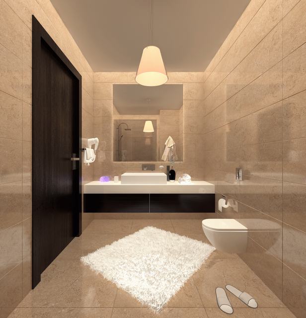 Banyolarda Hilton lavabo, tuş teknesi ve duşa kabin.